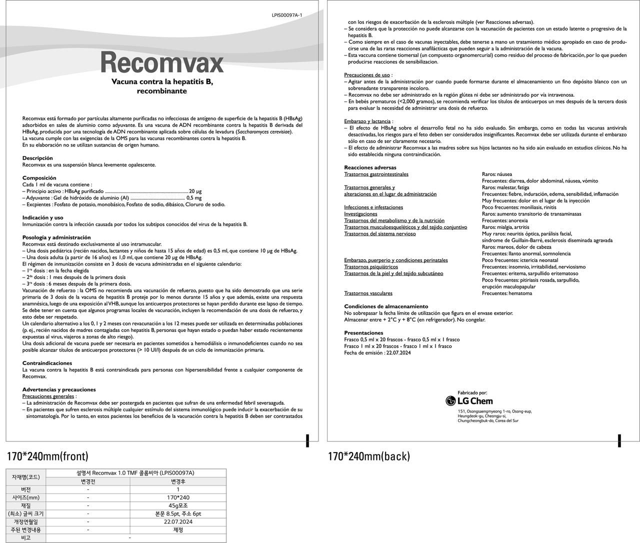 La vacuna RECOMVAX, del laboratorio LG está compuesta por partículas altamente purificadas, no infecciosas, del antígeno de superficie de la hepatitis B (HBsAg) adsorbidos en sales de aluminio y preservadas con Timerosal.